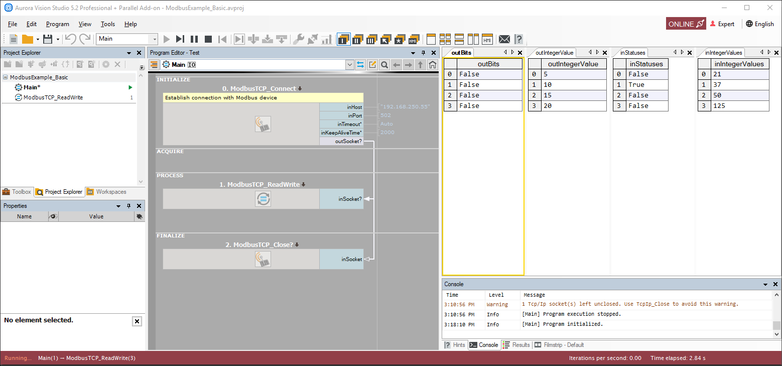 Then open a new Aurora Vision Studio project, add the ModbusTCP_Connect filter to the INITIALIZE section and the ModbusTCP_Close filter to the FINALIZE section. Aurora Vision Studio provides a set of ready-to-use filters for communication over the ModbusTCP protocol. A full list of the relevant filters is available here.