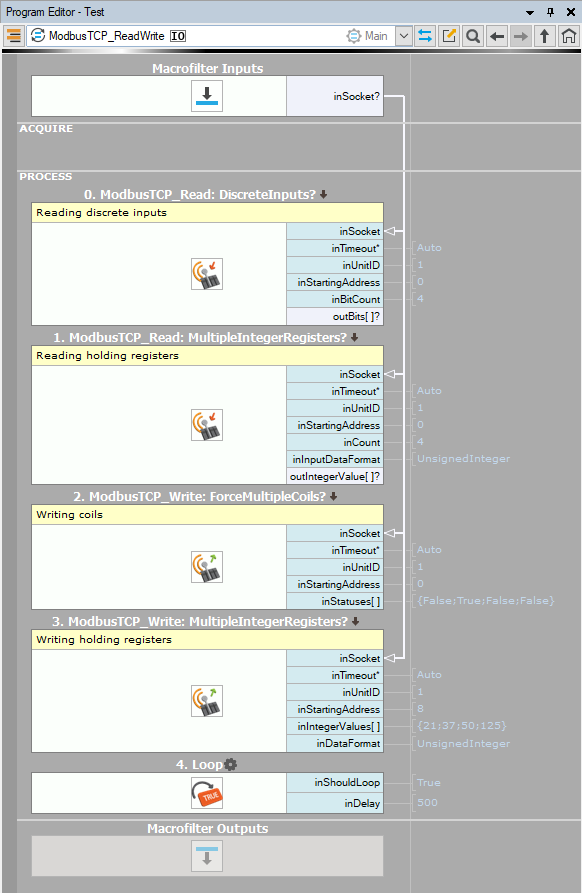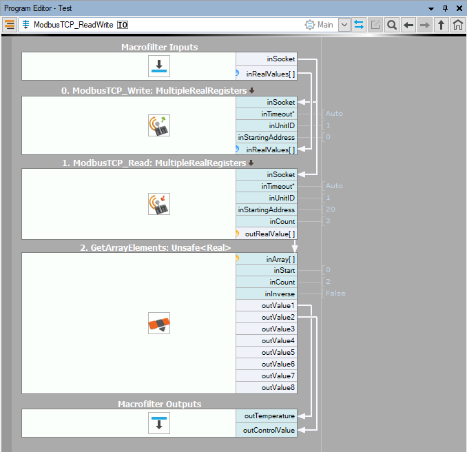 The ModbusTCP_ReadWrite macrofilter which is invoked in the online mode: