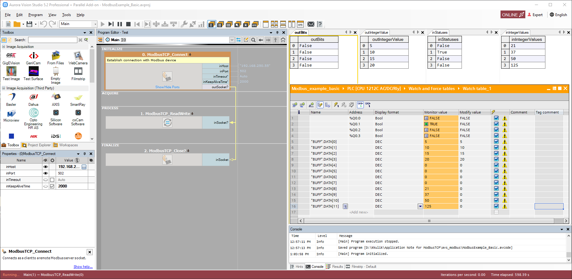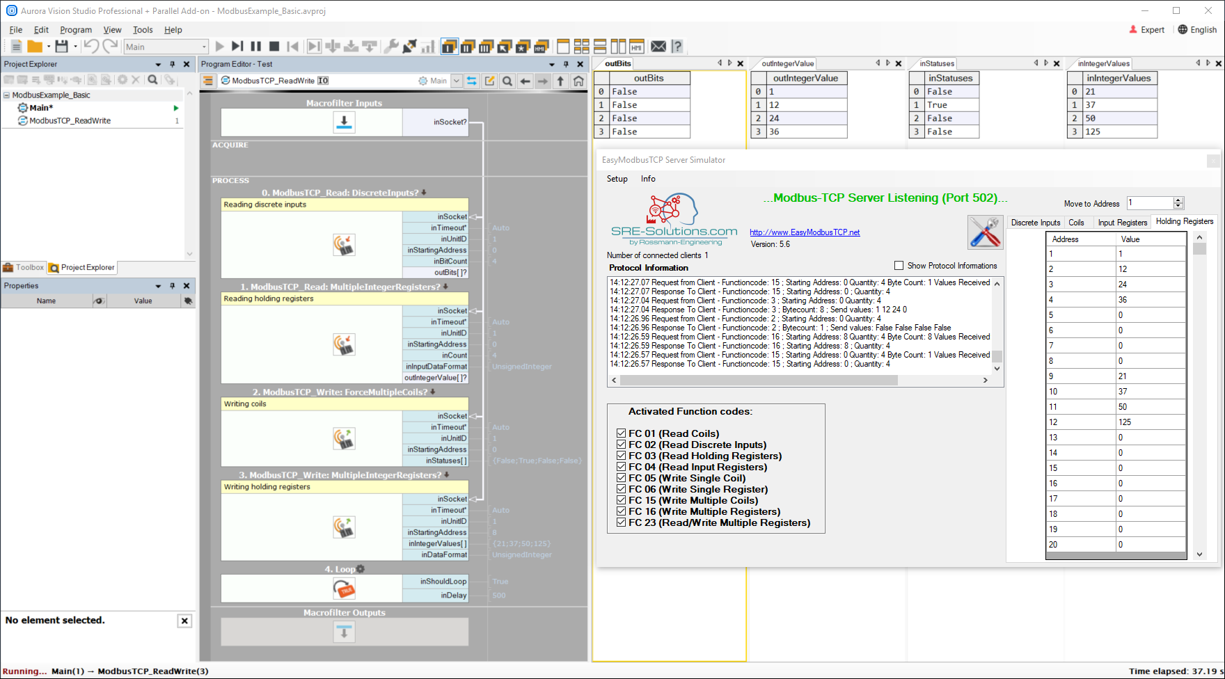 Below you can see working communication between the ModbusTCP client within the Aurora Vision Studio application and the simulated server.