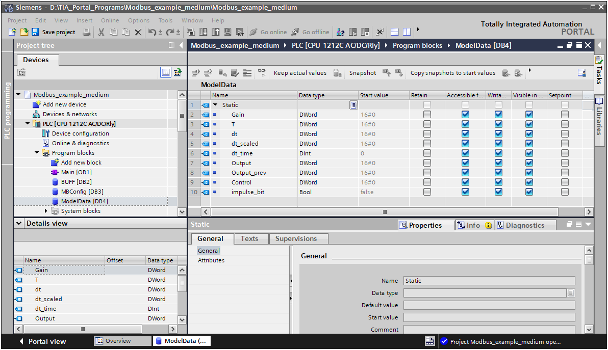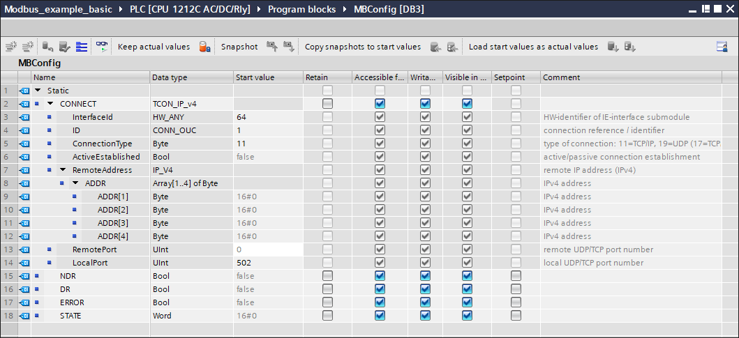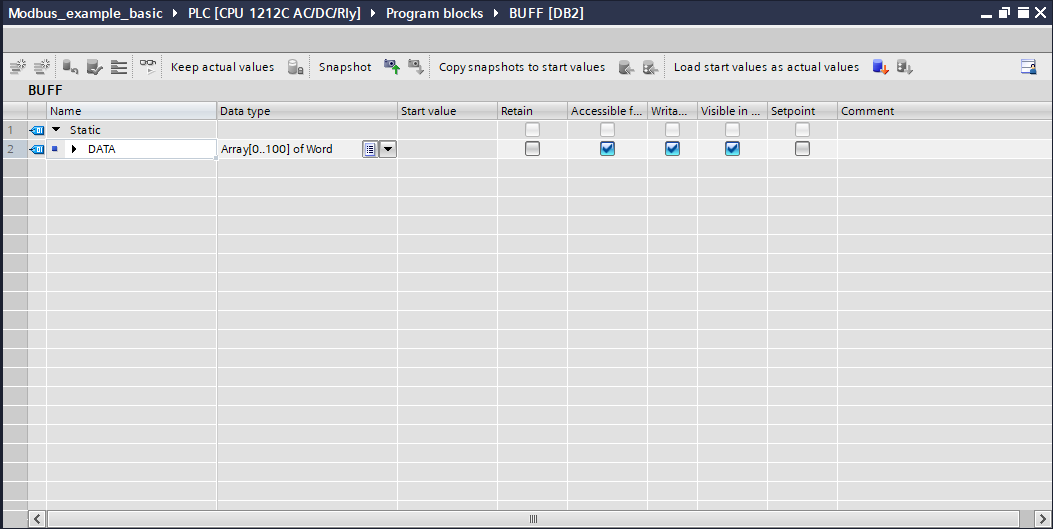 This chapter describes how to modify a basic PLC program to meet requirements of advanced usage as mentioned at the beginning of this article. If you have created a Basic PLC program described in the previous chapters, save this project as a copy with a new name. Otherwise, create BUFF and MBConfig data blocks as described in this section.