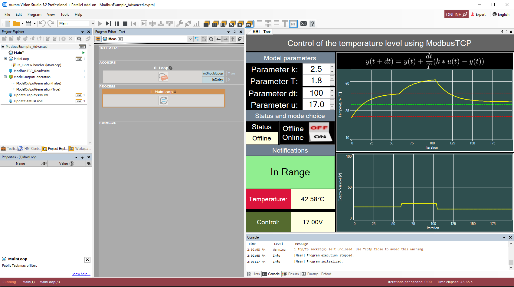 This Application Note does not explain how to create an HMI for an advanced program example. Take a look at the official Aurora Vision Studio example ModbusExample_Advanced.