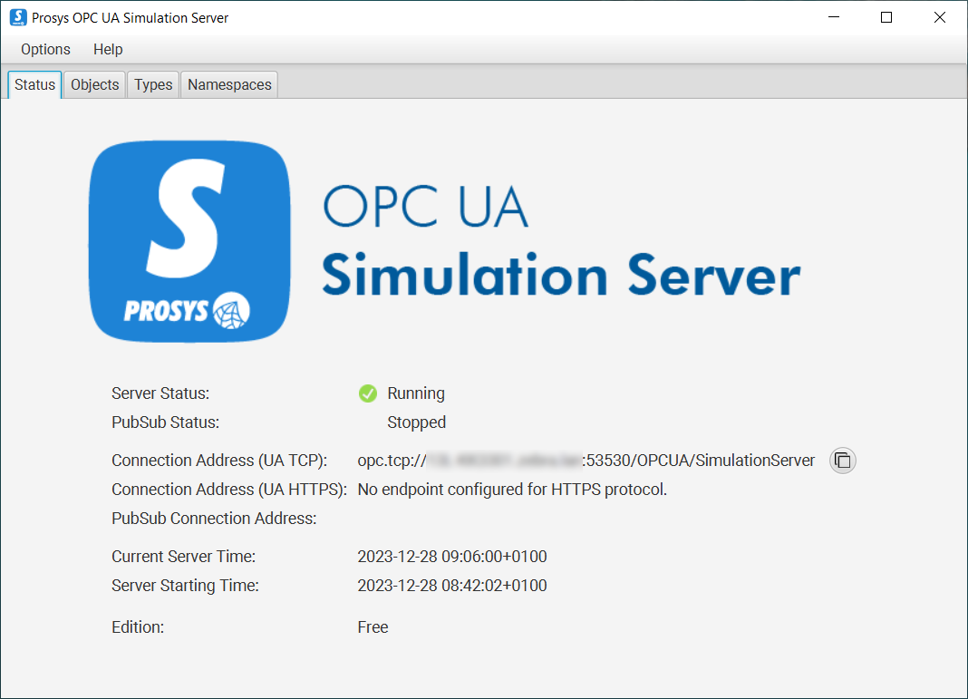 Open the OPC UA Simulation Server and navigate to the Status tab. The Connection Address (UA TCP) will be further needed for the Aurora Vision Studio client: