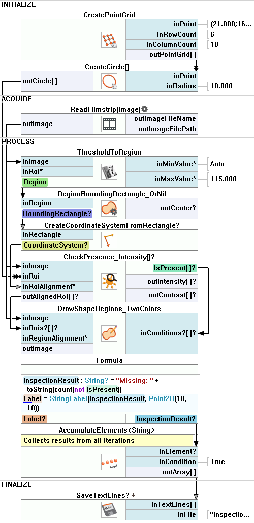 8. Inspection of buttons presence can be performed by the CheckPresence_Intensity filter. Add this filter to the PROCESS section and connect its inputs: