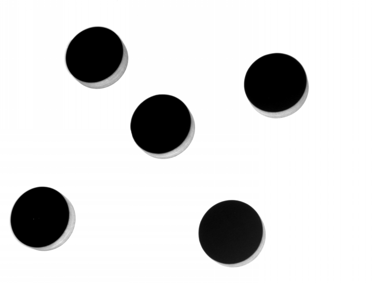 The fastest and simplest way to detect the black discs is the Blob Analysis technique. To fit the circle to the found objects, use the FitCircleToEdges and FitCircleToPoints. You don't have to transform the whole image to get results in millimeters, only the points of the object.