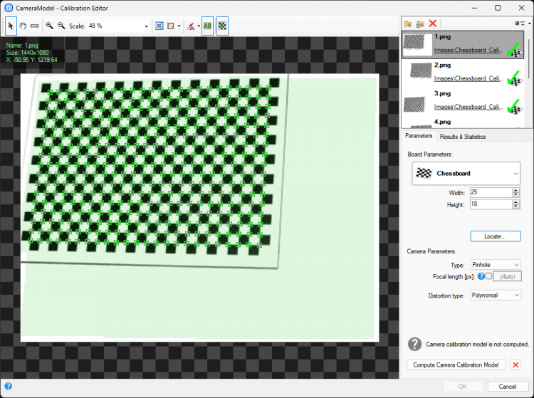 • In the Board Parameters section, choose the Chessboard. Set the Width to 25 and the Height to 18. Then, click the "Locate" button. The vertices of the chessboard squares should be marked in green.