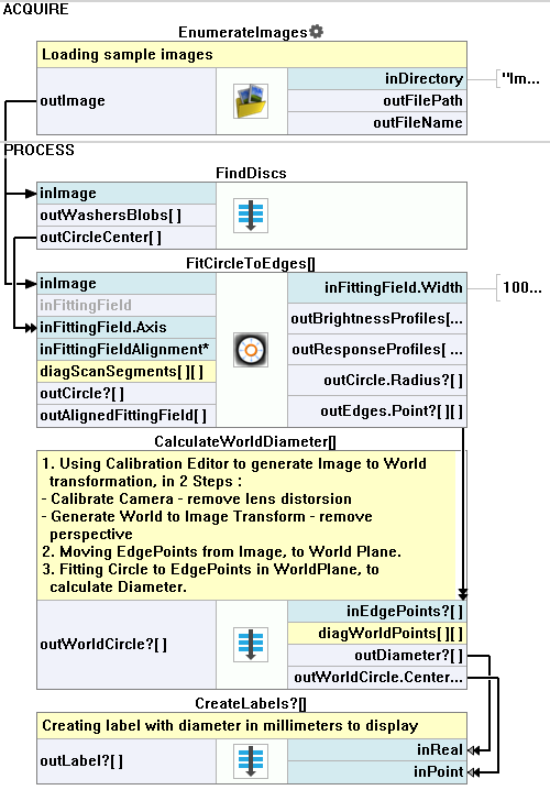 22. Drag the outDiameter output from the CalculateWorldDiameter macrofilter to the CreateLabels macrofilter and name the new input inReal.