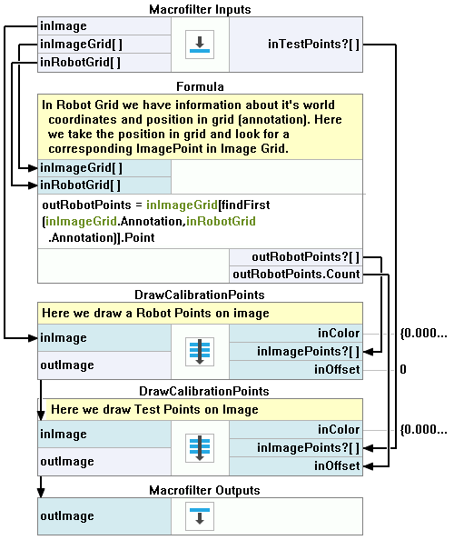 - Connect the "DrawPoints" macrofilter's inImage input with the inImage input of the "DrawCalibrationPoints" macrofilter,