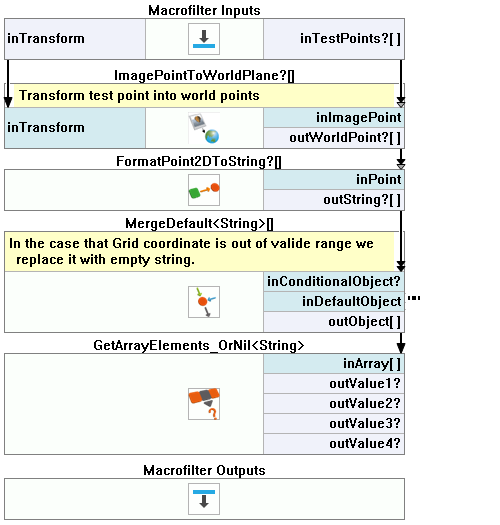 - Connect the outTestPoints output from "GetTestPointsFromHMI" macrofilter with theinTestPoints input of the "FindWorldCoordinatesForTestPoints" macrofilter.