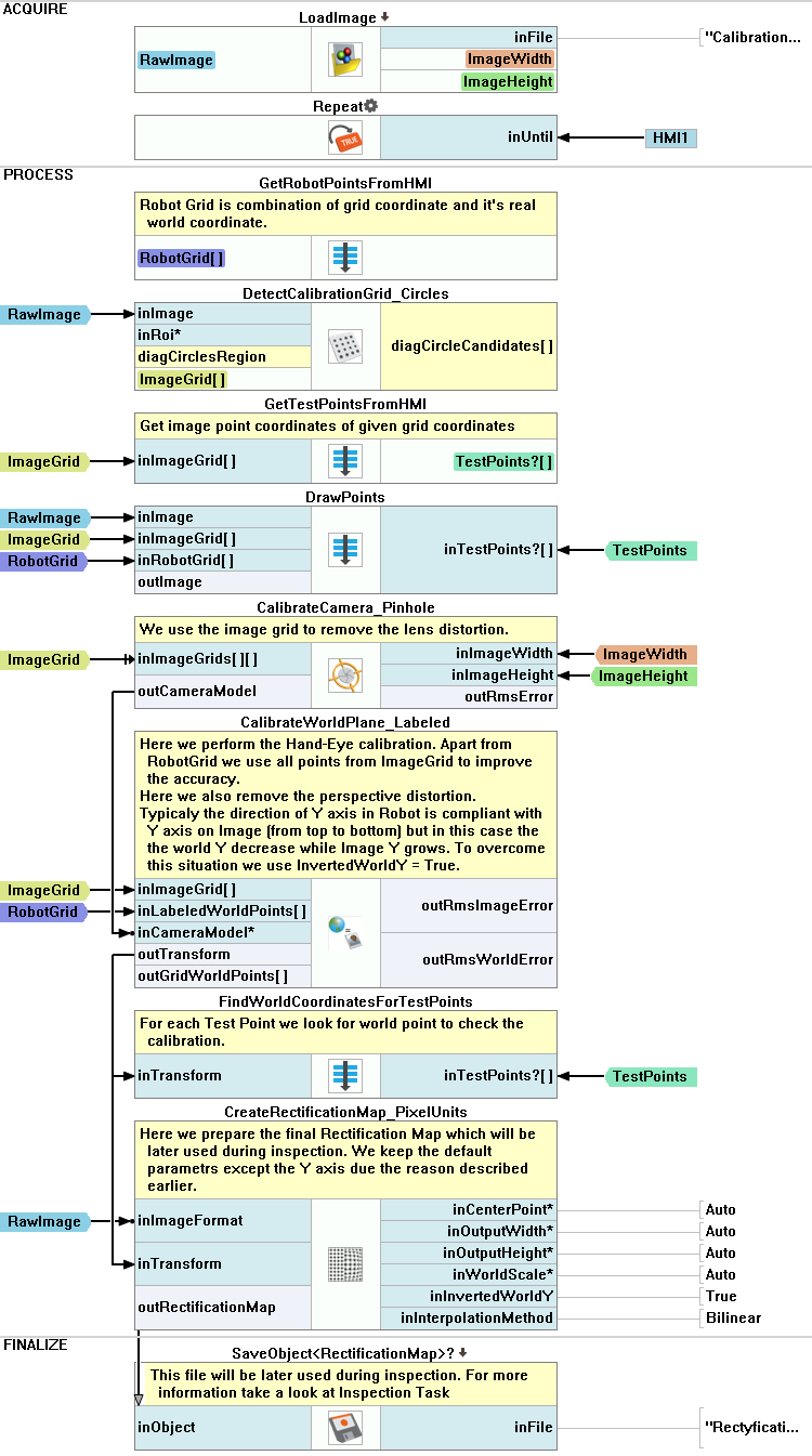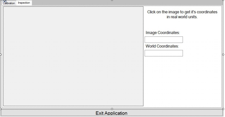 A robotics engineer should be able to select a number of appropriate grid point coordinates and for each of them provide the Real World Points (here called Calibration Points) obtained from the robot's interface for each of them. Based on this input data and an image of the calibration grid, the program should prepare a RectificationMap with all calibration data stored inside. Finally, after clicking Exit Application, the RectificationMap will be saved to disk. Additionally, after calibration, the program should compute a set of Test points, in which a corresponding Robot Point should be provided for each Grid point. The aforementioned requirements refer to the content and functionalities of the Calibration tab. The program should be implemented in the Main worker task. Moreover, the HMI should also contain an Inspection tab as well as a corresponding Inspection worker task, implementing the typical usage of the Rectification Map.