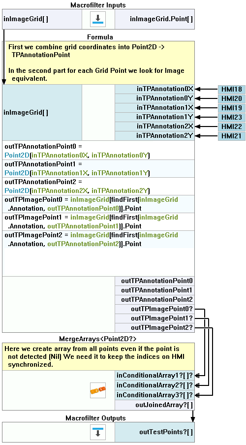 Create an AnnotatedPoint2DArray Formula's input, name it inImageGrid and connect it with the macrofilter's input. In this step, grid coordinates are combined into test annotation points with the Point2D data type, and then for each Grid Point, its Image equivalent is being located.