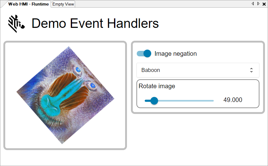 • Create WebHmi Event handler for ValueChanged named "SliderRotateImage".