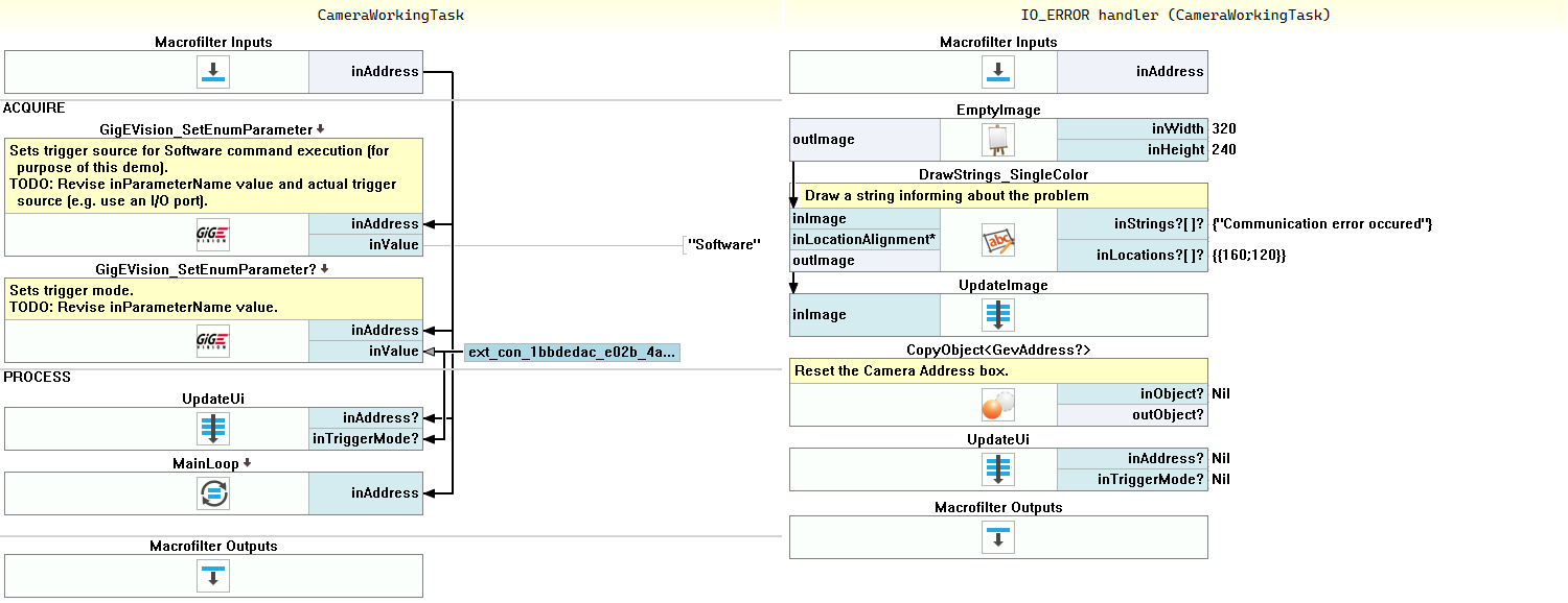 Inside the CameraWorkingTask, connect the macrofilter input with the 2 GigEVision_SetEnumParameter filters' inputs, the UpdateUi macrofilter input and the UpdateImage macrofilter input.