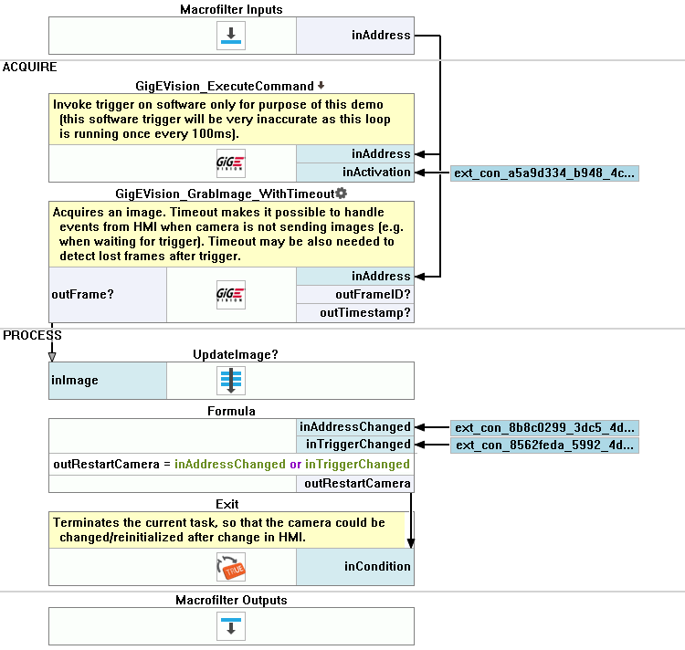 Inside the MainLoop macrofilter, connect the macrofilter input to the GigEVision_ExecuteCommand and the GigEVision_GrabImage_WithTimeout inputs.