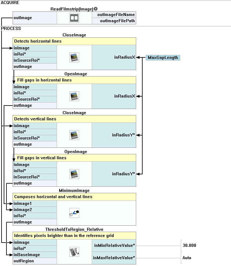 8. Connect the global parameter MaxGapLength to the inRadiusY input ports of both CloseImage and OpenImage filters.