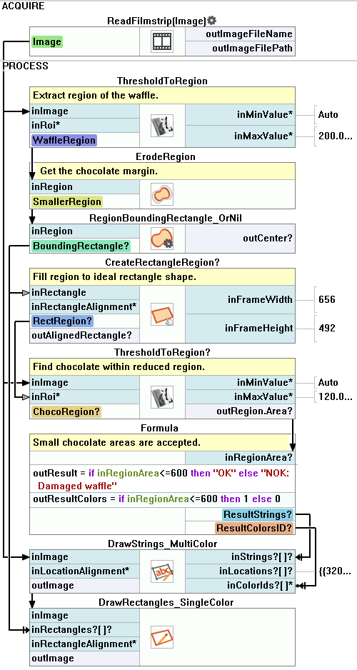 - If you want to threshold the image just in area of the waffle, use the ThresholdToRegion again, set the inMaxValue to 120, connect the inImage with the ReadFilmstrip output and connect the inRoi with the outRegion from the CreateRectangleRegion filter.