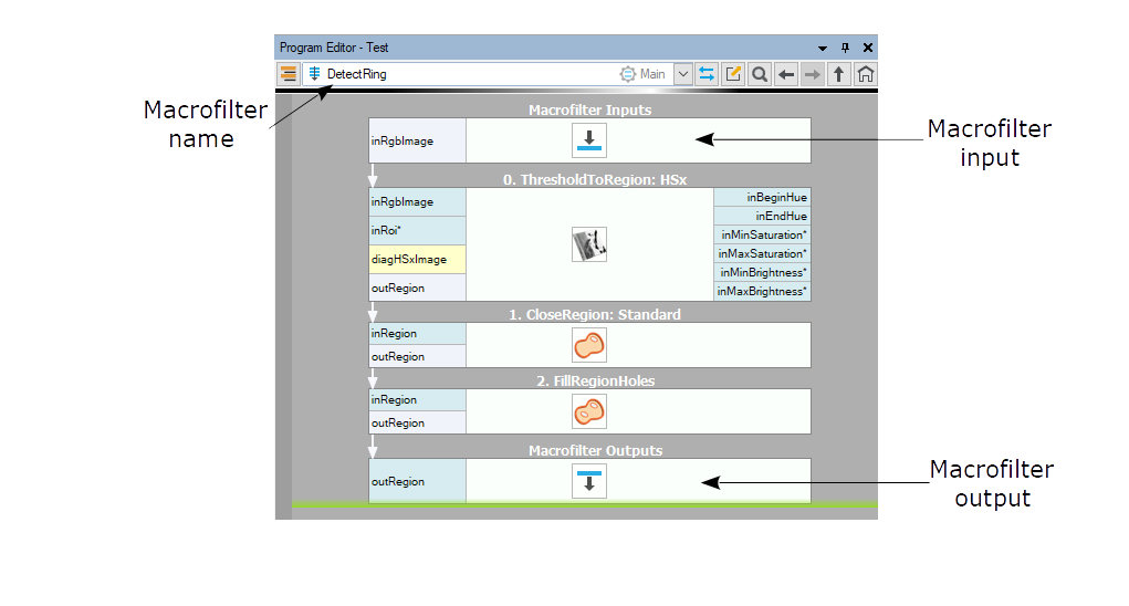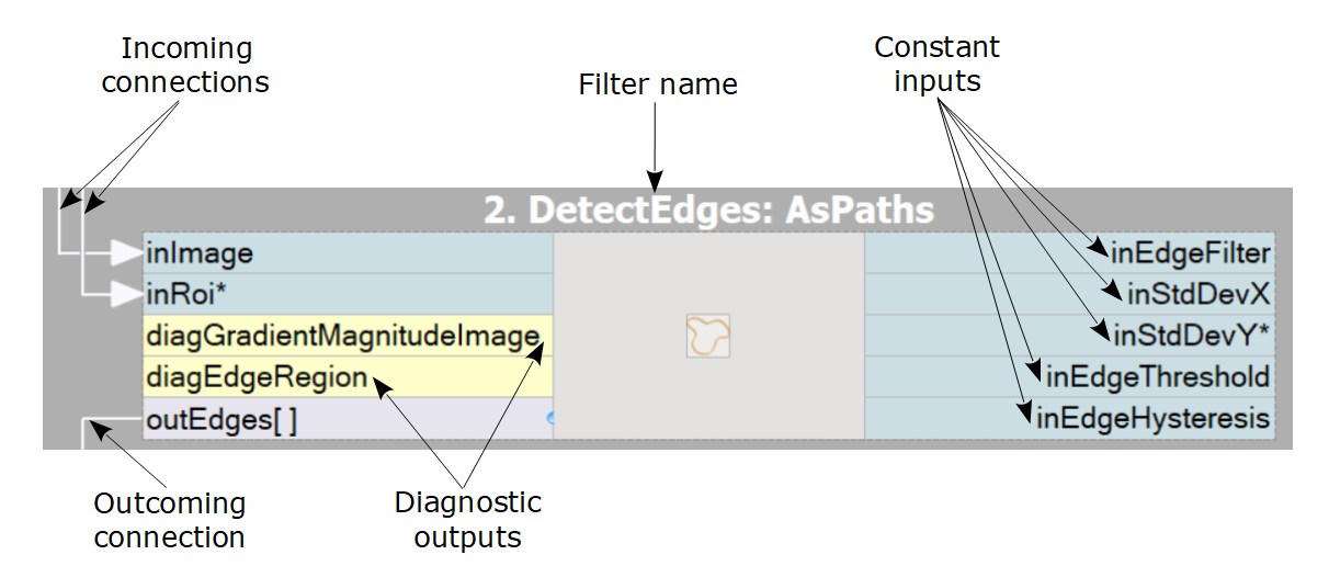 Filters are the basic data processing elements in data flow programming. In a typical machine vision application there is an image acquisition filter at the beginning followed by a sequence of filters that extract information about regions, contours, geometrical primitives and then produce a final result such as a pass/fail indication.