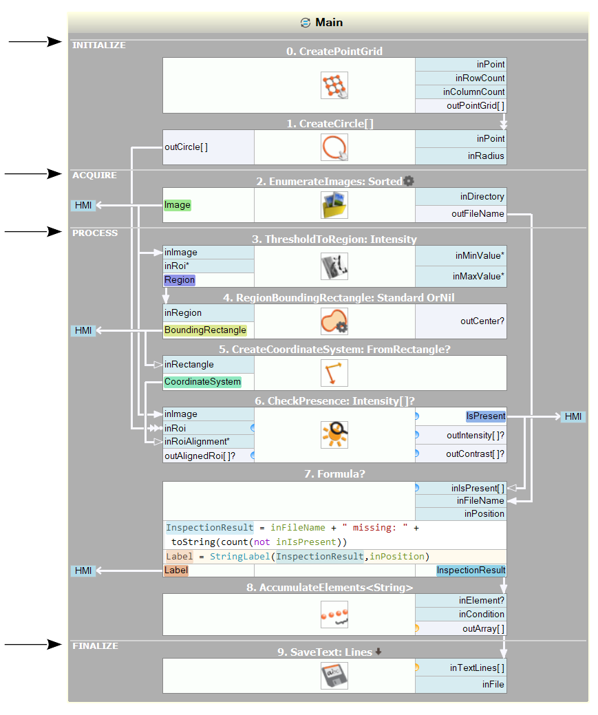 ACQUIRE – this section is intended to include filters from loop generation category like EnumerateImages or GigEVision_GrabImage that generate stream of data that will be processed or analyzed in the next section. Filters in this section will be executed in every iteration.