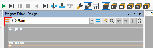 To change the default view of the sections in the Program Editor click on the button located to the left of the macrofilter name in the top bar of the Program Editor