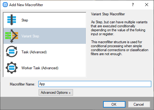 - Create a Variant Step macrofilter (e.g. "App") for the State Machine with variants corresponding to individual states.