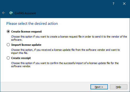 To create WibuCmRac file, which is necessary for process of update, first option should be selected, "Create license request".