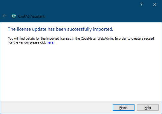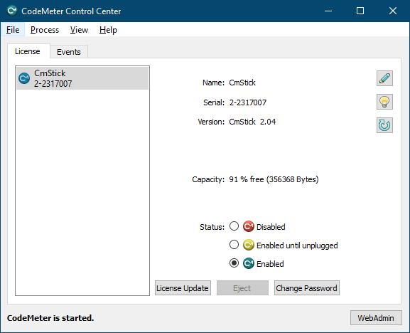 As previously, Control Center needs to be opened by clicking on its icon in tray. Dongle needs to be selected, and "License update" should be clicked. Note that WibuCmRau file can only be used once, and will work only with dongle, from which the corresponding WibuCmRac was created.
