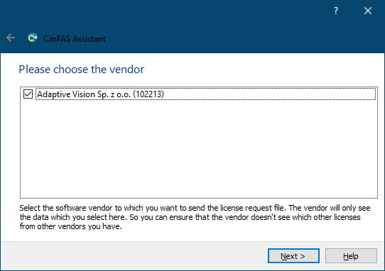 In next window one can choose which vendors' license is wanted to be updated. "Adaptive Vision Sp. z o.o." should be selected.