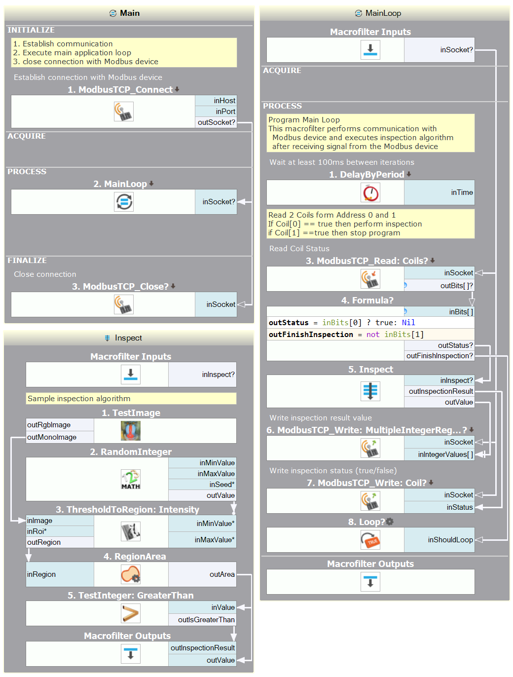 To communicate with a ModbusTCP device, first, a connection needs to be established. The ModbusTCP_Connect filter should be used for establishing the connection. The default port for ModbusTCP protocol is 502. Usually, a connection is created before the application enters its main loop and it remains valid through multiple iterations of the process. It becomes invalid when it is explicitly closed using ModbusTCP_Close filter or when an I/O error occurs.