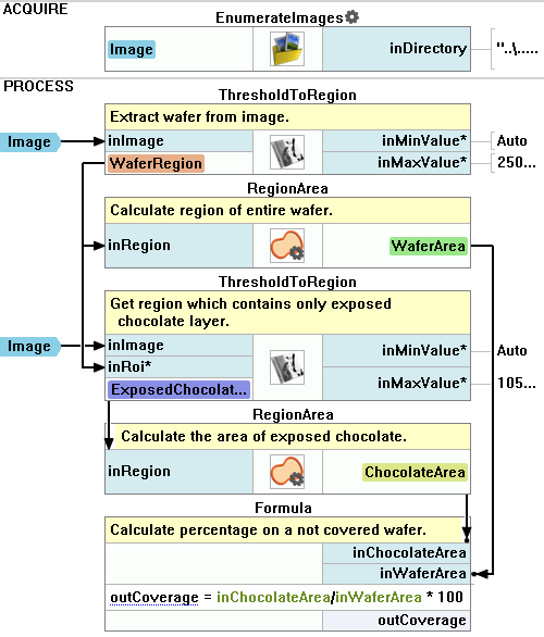 Find the wafer using the ThresholdToRegion filter (PROCESS section) with parameters: inMaxValue set to 250 and inMinValue set to Auto. These values allow the program to get the bar from a contrasting background (backlight).