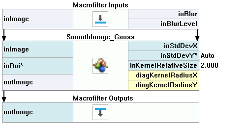 In the "True" variant, the input image should be blurred using SmoothImage_Gauss. Show the filter's inStdDevX input and connect it to the macrofilter's inBlurLevel input.