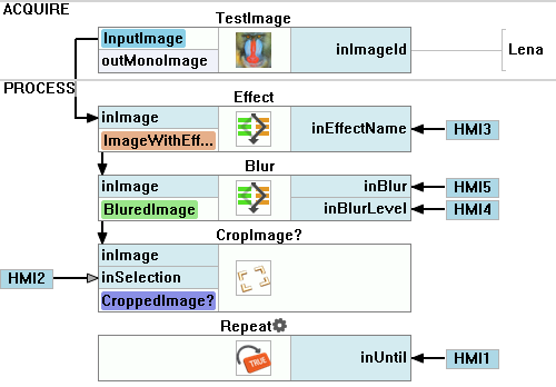 Add the Repeat filter to process the program in a loop. Connect the value from ImpulseButton to inUntil so that the program stops when the button is pressed.