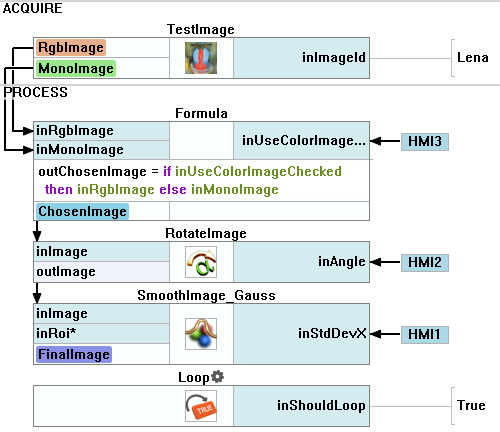 Add the Formula filter to switch between RGB and Mono images. Connect outRgbImage and outMonoImage, and add inUseColorImageChecked input of Bool type to it. Create a new output, ChosenImage, of type Image and create there an message: