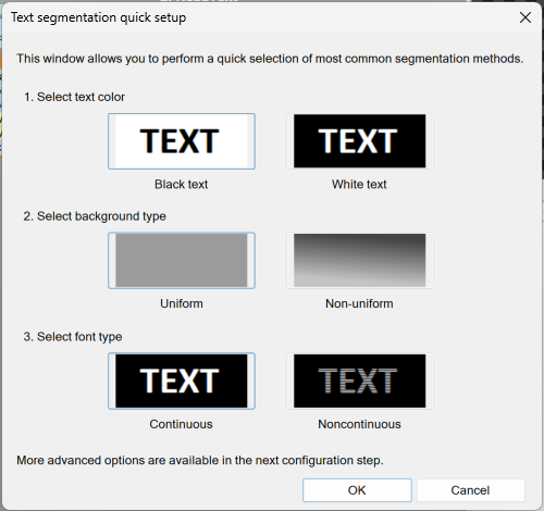 4. When entering first time, complete the quick setup by selecting most common settings. In this example a black non-continuous text should be extracted from a uniform background. Configuration was set to meet these requirements.