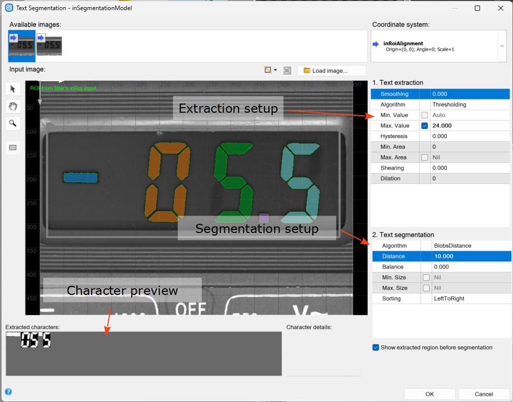6. Configure a character extraction algorithm. In this case thresholding value is too high and must be reduced.