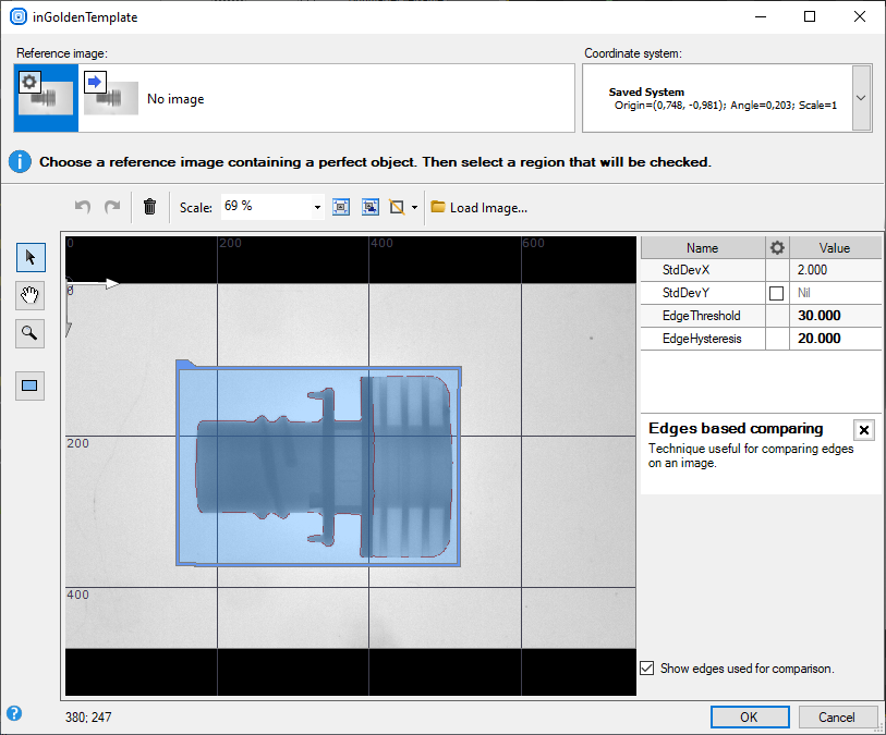 Golden template technique is the most powerful method for finding objects' defects. Editor presented below is available in filters CompareGoldenTemplate_Intensity and in CompareGoldenTemplate_Edges.