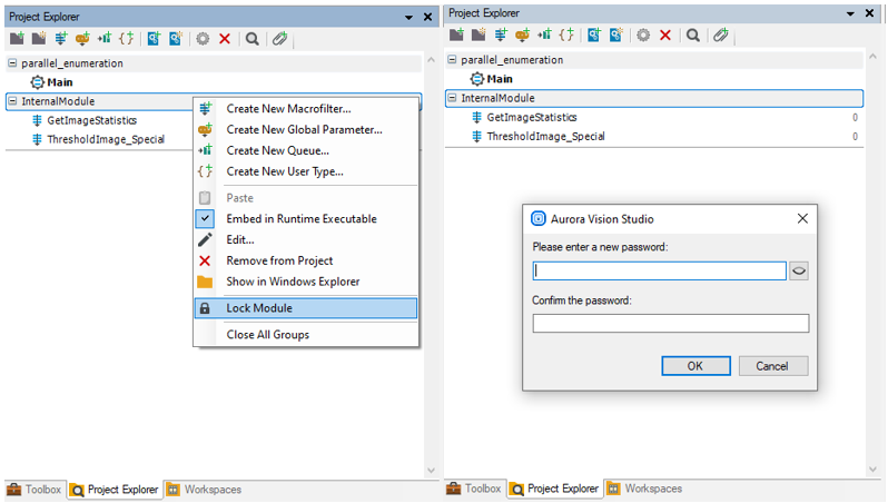In order to unlock a module you need to select the Unlock Module option in the ProjectExplorer and enter the correct password. To completely remove module locking feature from a selected module, use the Remove Module Lock option.