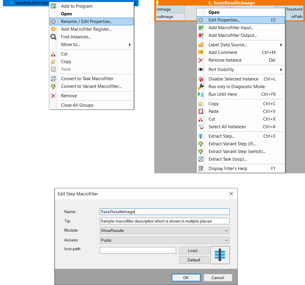 After creating a module you may move already existing macrofilters into the module by dragging them onto the module in Project Explorer. Clicking the Create New Macrofilter... button allows you to create a new macrofilter with the given name. During that you can access Advanced options by clicking the appropriate button. There you can specify the parent module and access to the macrofilter. Access can be either private or public. Private macrofilters cannot be directly used outside its module. You can also provide a tooltip (description) for the macrofilter. This will show up in the properties section of an instance and when hovered over in the Project Explorer. Tooltip should describe the macrofilter's purpose and be concise. They are especially important when creating an