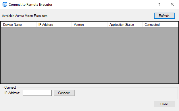 In Aurora Vision Studio the list of available remote systems is accessible in the Connect to Remote Executor window which opens up after choosing the File › Connect to Remote Executor menu command: