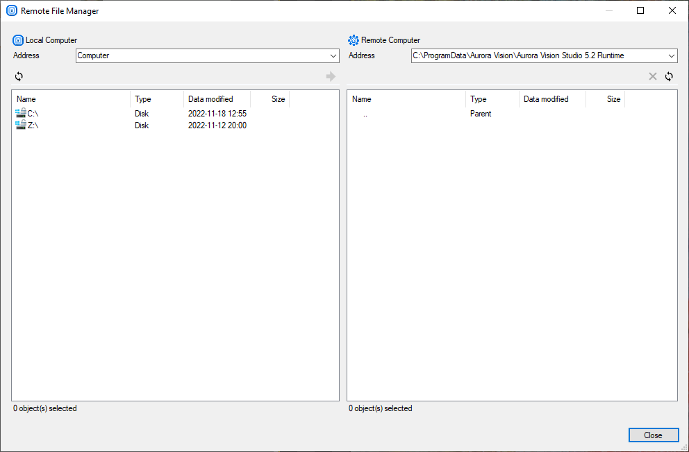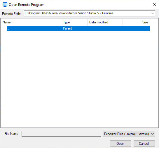 To Manage Files on remote executor, click Upload Files button. In this window it is possible to send program files to the remote executor. By default all files are stored in the directory <CommonApplicationData>\Aurora Vision\Aurora Vision Executor.