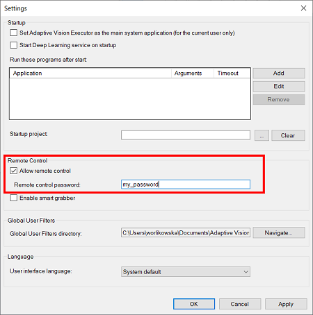 It is possible to use Aurora Vision Studio to control an Aurora Vision Executor running on a remote computer, if only the two computers are in the same Ethernet subnet. To enable remote access in Aurora Vision Executor, the option "Allow remote control" should be enabled. For security reasons, it is also possible to protect connection with a password: