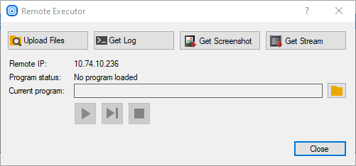 After successful connection, management of the selected executor becomes possible. Now you are able to do several actions: Upload Files, Control Program and Get Diagnostics.