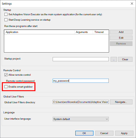 To enable remote image acquisition it is necessary to stop the executor program and enable the "Enable smart grabber" option: