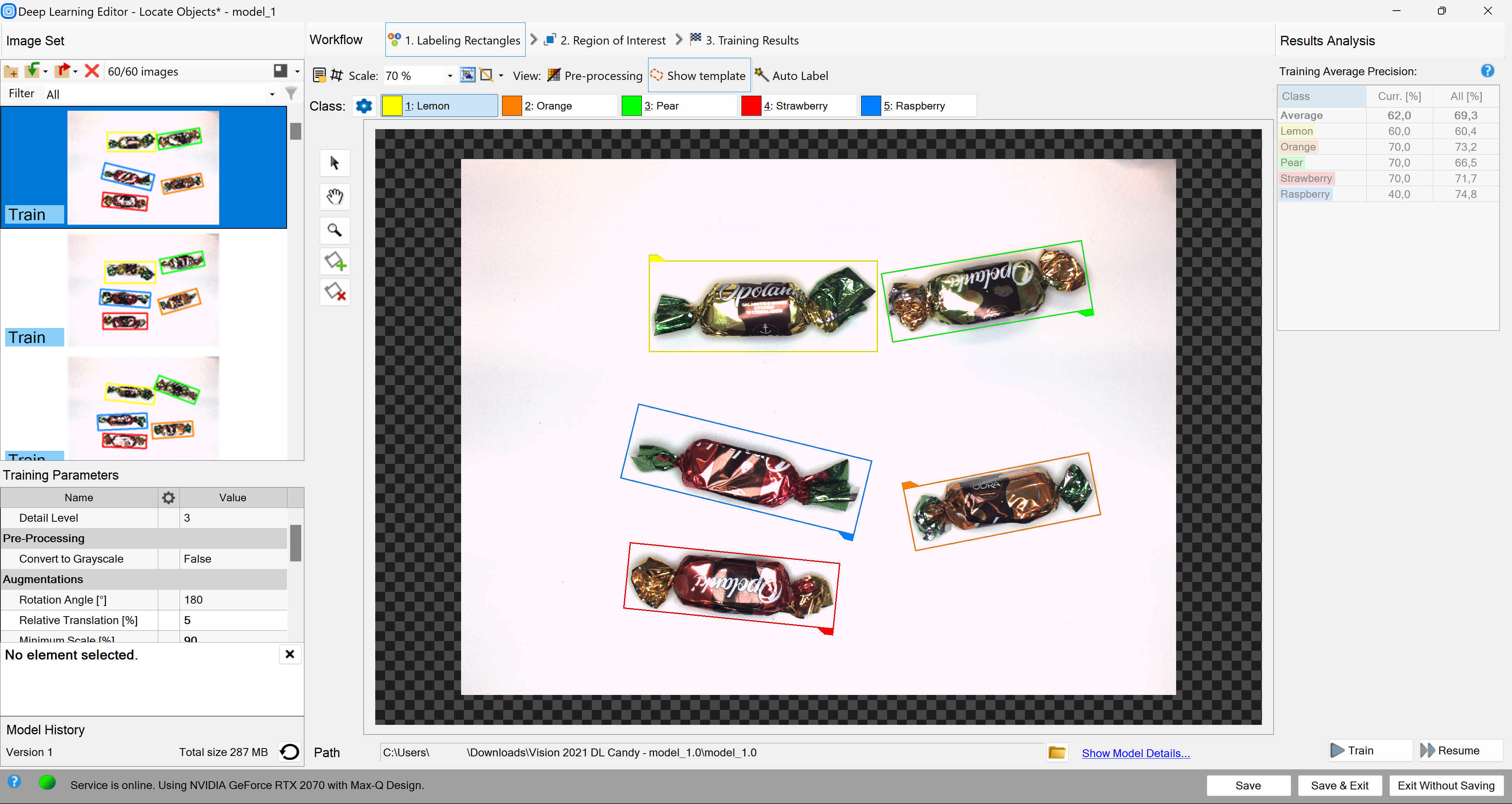 - Downsample – reduction of the image size to accelerate training and execution times, at the expense of lower level of details possible to detect. Increasing this parameter by 1 will result in downsampling by the factor of 2 over both image dimension.