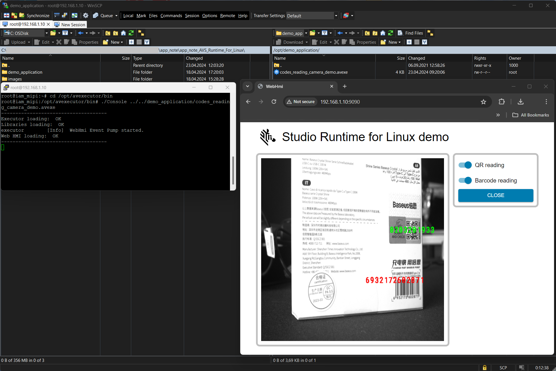 To manage and exchange files on the target system SSH connection is established. For convenience WinSCP and PuTTY are configured following the Getting started with the Windows Host System guide.
