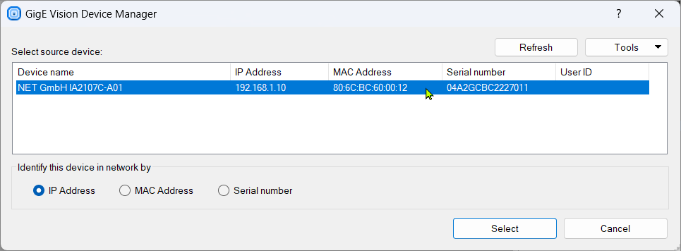 Please determine if the smart camera is visible in the GigE Vision Device Manager: