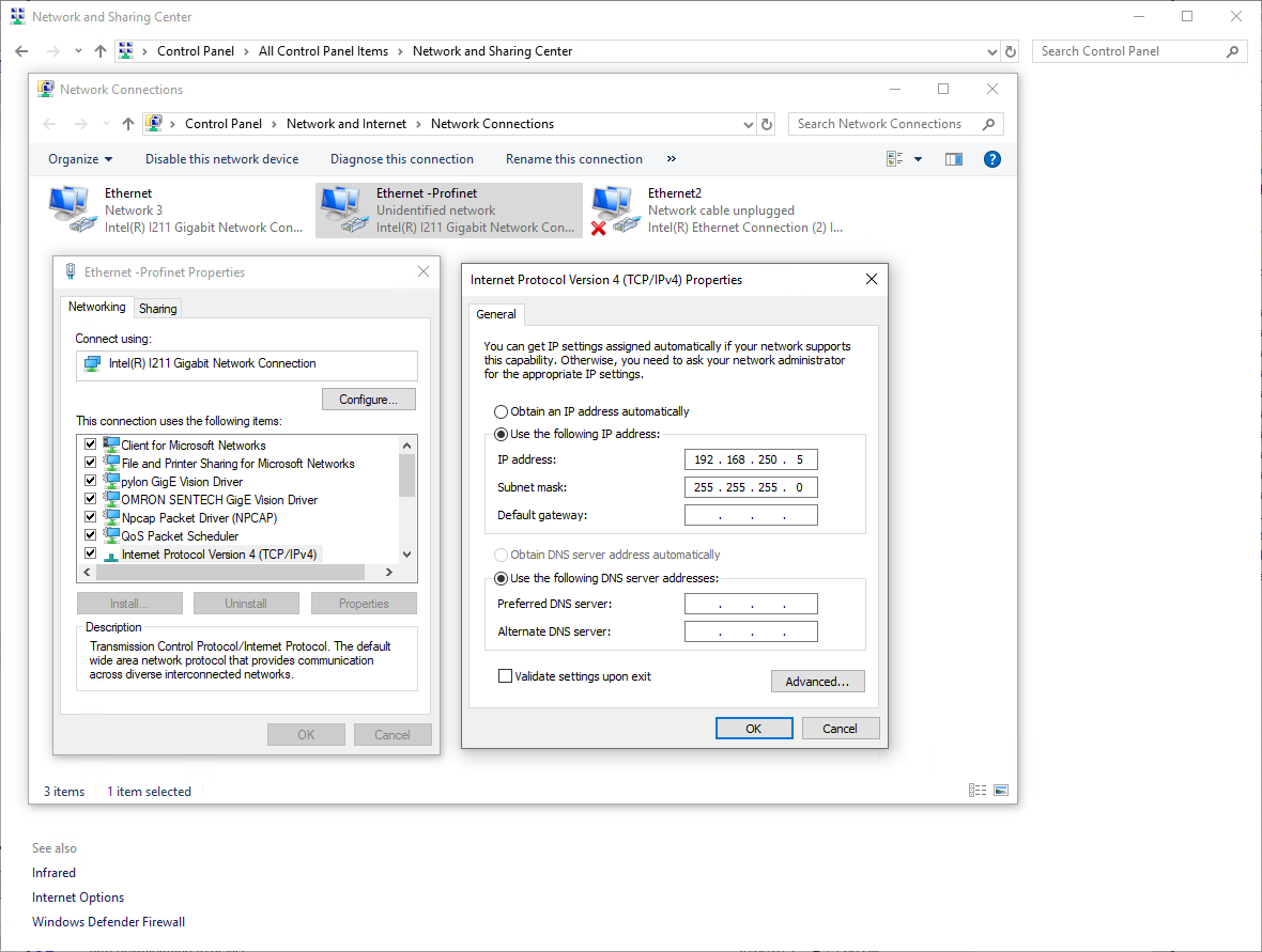 As first configure computer with TIA Portal. Change address of the network card connected to the switch to 192.168.250.5 as shown below: