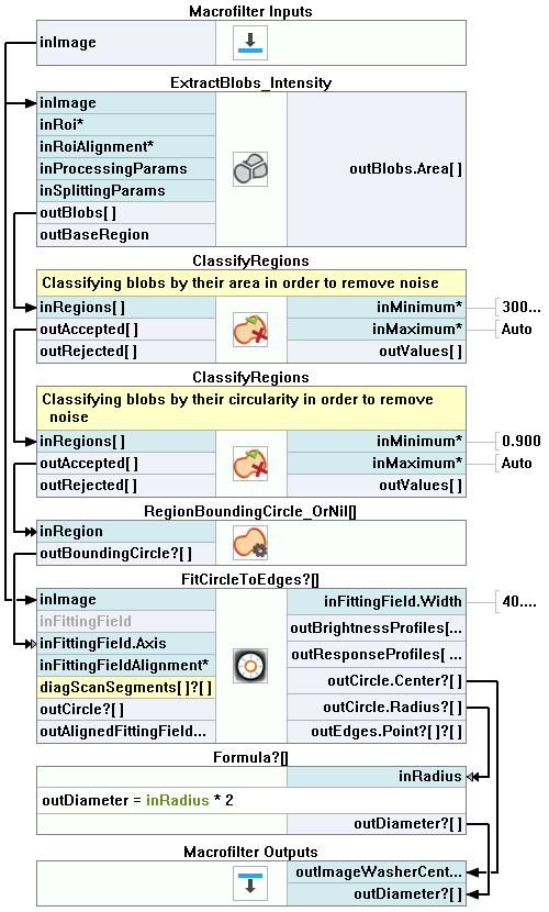 - For the first one, connect the inPixels to the Diameter macrofilter's input.