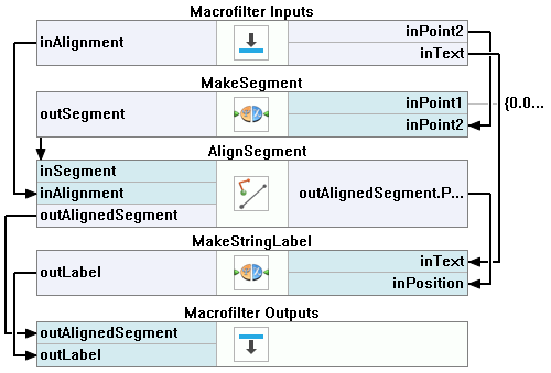 - Add the AlignSegment filter. Connect the inSegment input to the previous filter's output. Connect the inAlignment input to the macrofilter's Alignment input. Expand the outputs to get the outAlignedSegment Point2 value. Drag the outAlignedSegment output to the Macrofilter Outputs section.