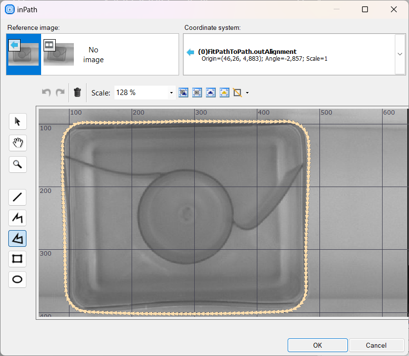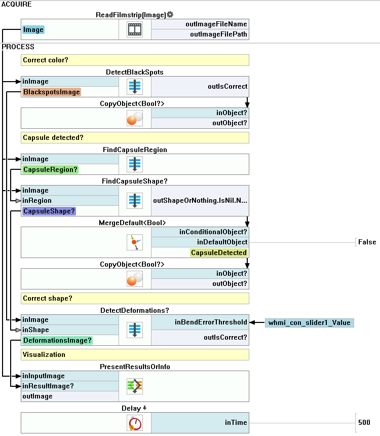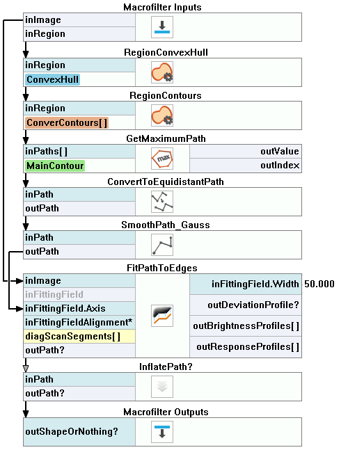 The task of macrofilters FindCapsuleRegion and FindCapsuleShape was to extract the contour of the capsule. Next, create a Step macrofilter DetectDeformations. In this filter, you will be calculating the distance between the outShapeOrNothing path and the model path. If the distance is longer than specified, the capsule is considered damaged.