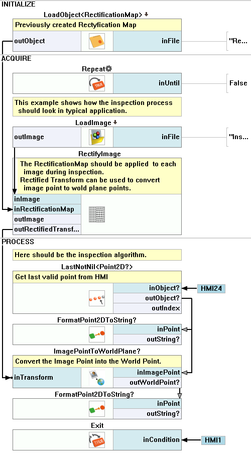 - Connect the outRectifiedTransform output from the RectifyImage filter with the inTransform input of the ImagePointToWorldPlane filter,
