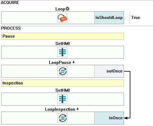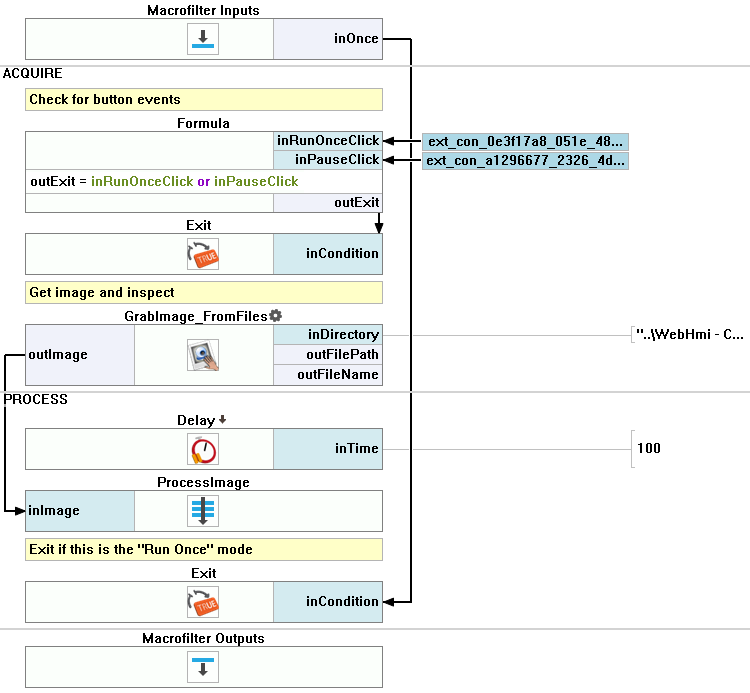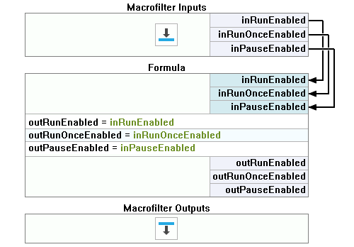 Go to the LoopInspection macrofilter. Connect the formula inputs to the Value outputs of the Run Once and the Pause HMI buttons.